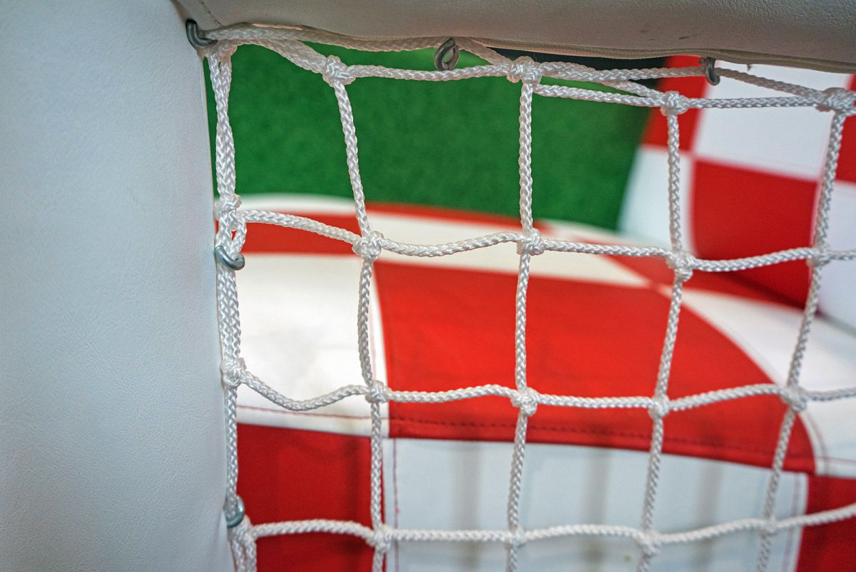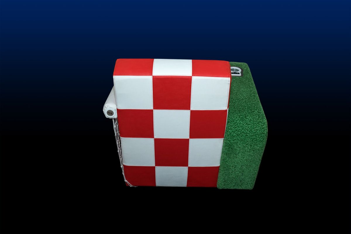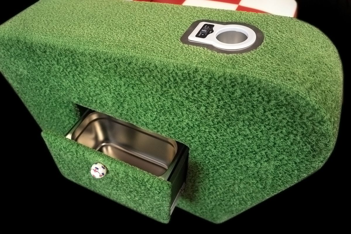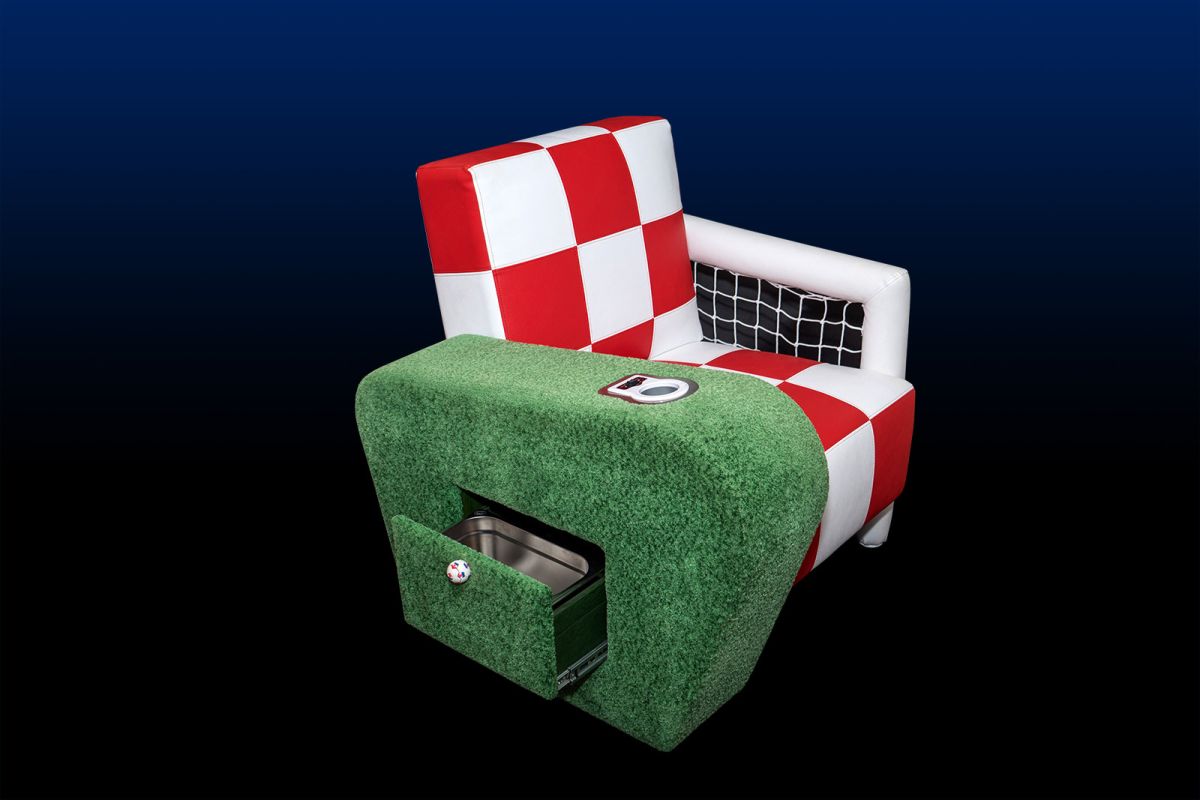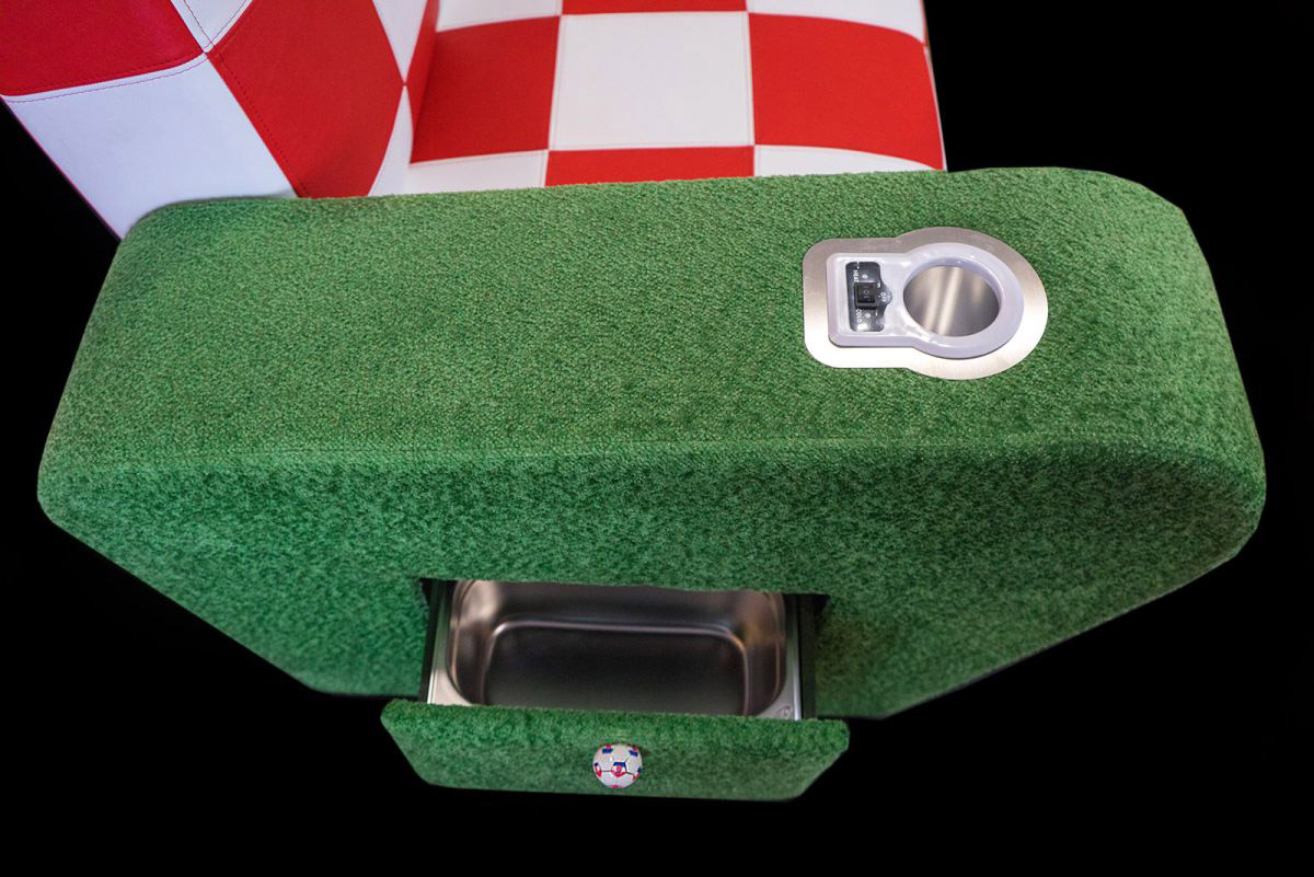 Green grassy part is used as right hand rest, on top of it there is a holder for glass or can, and at the bottom of this hand rest there is inox container for ice that can be filed up with up to eight cans. Left hand rest is representing a football goal (frame and net). Logo of a specific Football club or national team can be printed at the back rest. Few Examples