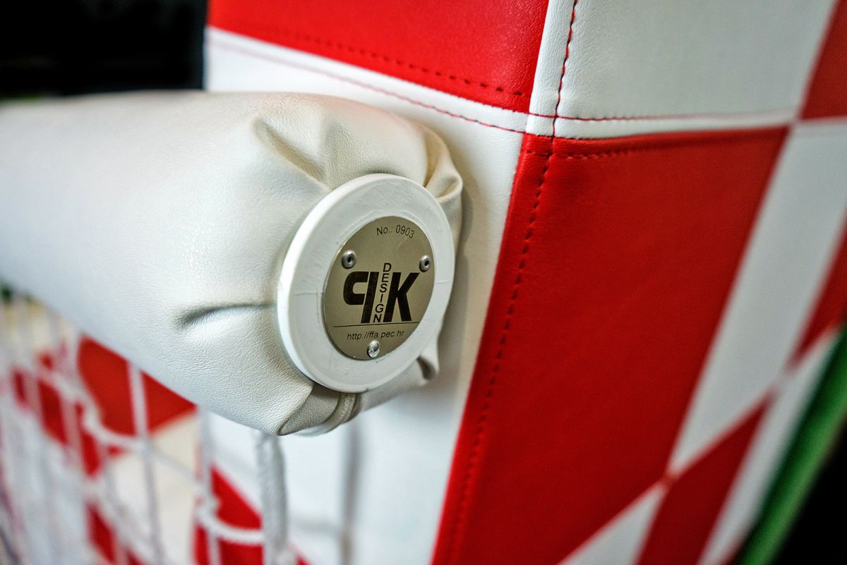 FFA is manufactured in three basic colors of ECO leather: red, white and blue. In the case of using other materials except ECO leather we produce covers in any desired color which are changeable and washable. Prototype and initial FFA production was made in Croatian national symbols (red and white squares). On the FFA left metal part, there are designer mark and serial number. Armchair is hand made from 4 basic parts, using high quality materials, hand made net, very durable ECO leather and high quality wooden construction.